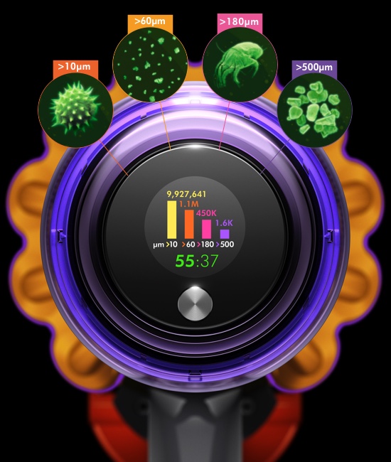Counts particles up to 15,000 times a second, adapting power to optimise suction and run time.