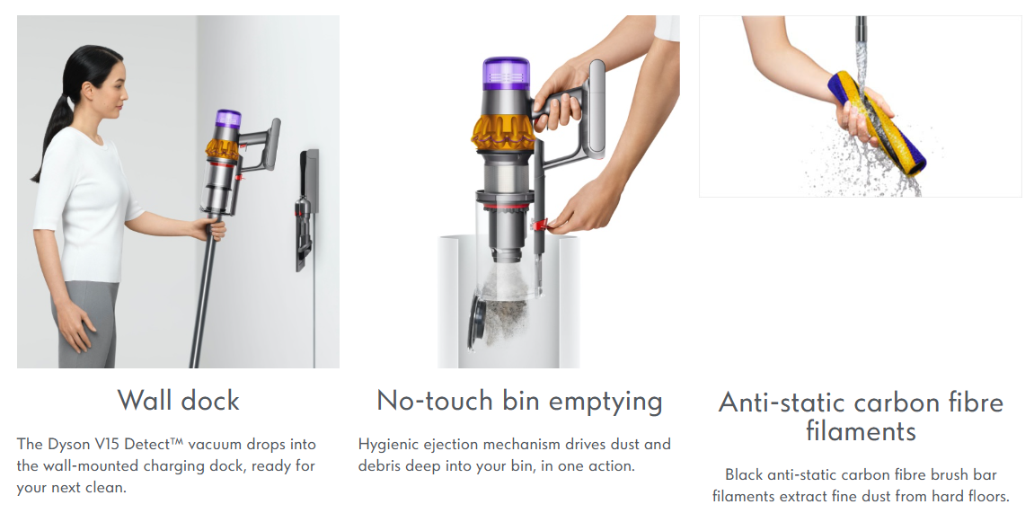 Dyson's V15 Detect Absolute hand vacuum with innovative Root Cyclone technology with 14 cyclones that increase air flow and Digital Motorbar cleaning head with anti-tangle technology effectively absorbs dust and hair from all floors.