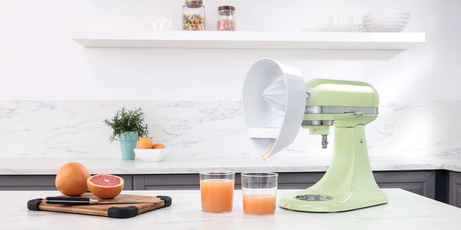 Ideal for working with large quantities of citrus fruits, this attachment speedily extracts the fruit juice into a bowl and filters the seeds.