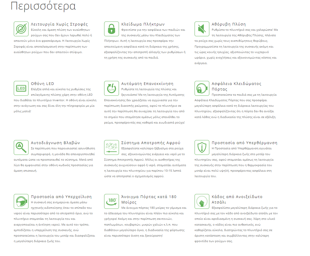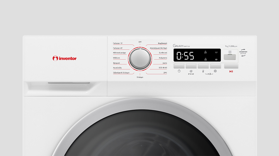 Όλα τα πλυντήρια ρούχων Inventor διαθέτουν Ελληνικό Μενού για να μπορείτε να χρησιμοποιείτε εύκολα και γρήγορα τη συσκευή και εσείς και όλα τα μέλη της οικογένειάς σας.