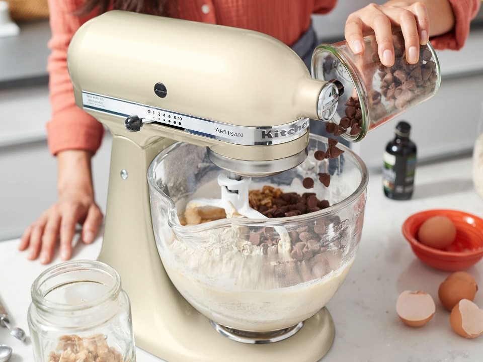 Plus, as you get more with the mixer 5KSM175PS, there’s an additional 3 L bowl too. This means you can switch between recipe steps and keep creating without having to stop and wash up. The mixer comes with a flex edge beater that scrapes the bowl while mixing, in a kind of spatula effect. So, everything is mixed really thoroughly, even on sticky mixtures.