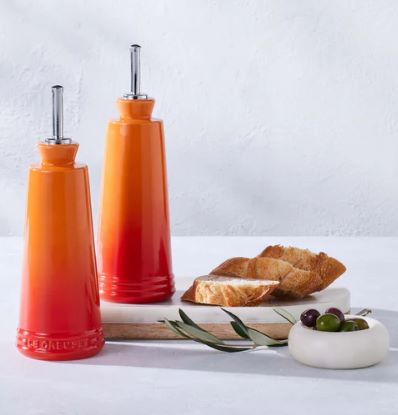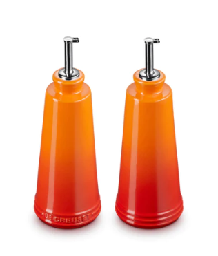 Whether dressing a salad or adding a drizzle of oil to a hot pan, this contemporary stoneware set is designed for everyday use. It includes one cruet with Le Creuset branding and one without for easy identification, along with stainless steel nozzles for precise pouring.