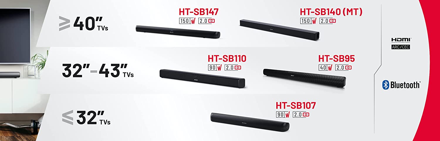 SHARP HT-SB140(MT) 2.0 Soundbar, 150W Slim Wireless Bluetooth Soundbar for TV and Device Streaming with HDMI ARC /CEC, Aux and Digital Optical-In, Wall Mount or Table Top Sound Bar – Black